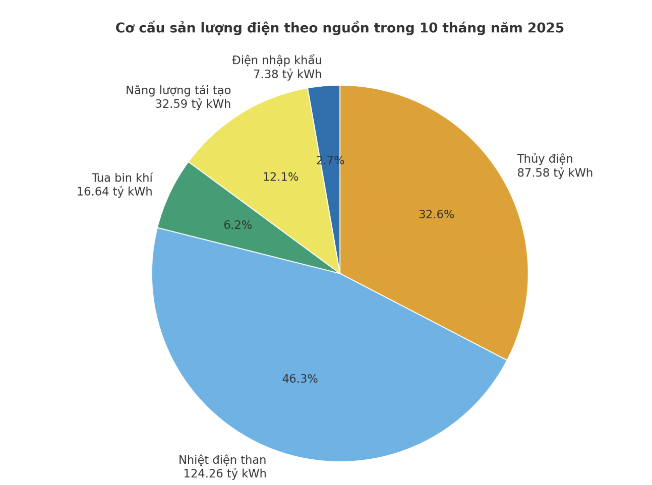 Cụ thể, thủy điện được huy động 87,58 tỷ kWh, chiếm 32,6% sản lượng điện toàn hệ thống; nhiệt điện than: đạt 124,26 tỷ kWh, chiếm 46,3%; tua bin khí: 16,64 tỷ kWh, chiếm 6,2%; năng lượng tái tạo: 32,59 tỷ kWh, chiếm 12,1% (trong đó điện mặt trời đạt 20,59 tỷ kWh, điện gió đạt 10,99 tỷ kWh); điện nhập khẩu: 7,38 tỷ kWh, chiếm 2,7%...