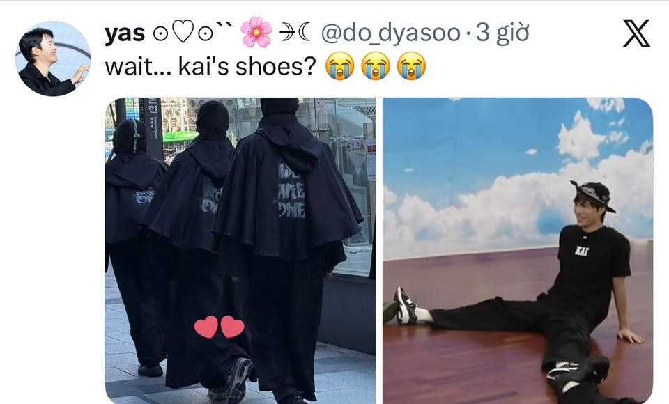Một điều thú vị khác khiến fan phấn khích chính là những bằng chứng cho thấy các thành viên EXO dường như không đứng ngoài cuộc mà đã trực tiếp tham gia vào đoàn diễu hành này. EXO-L đã soi ra chi tiết đôi giày của một người trong đoàn áo đen trùng khớp với mẫu giày mà Kai đã diện trong một video từng được đăng tải cách đó không lâu.
