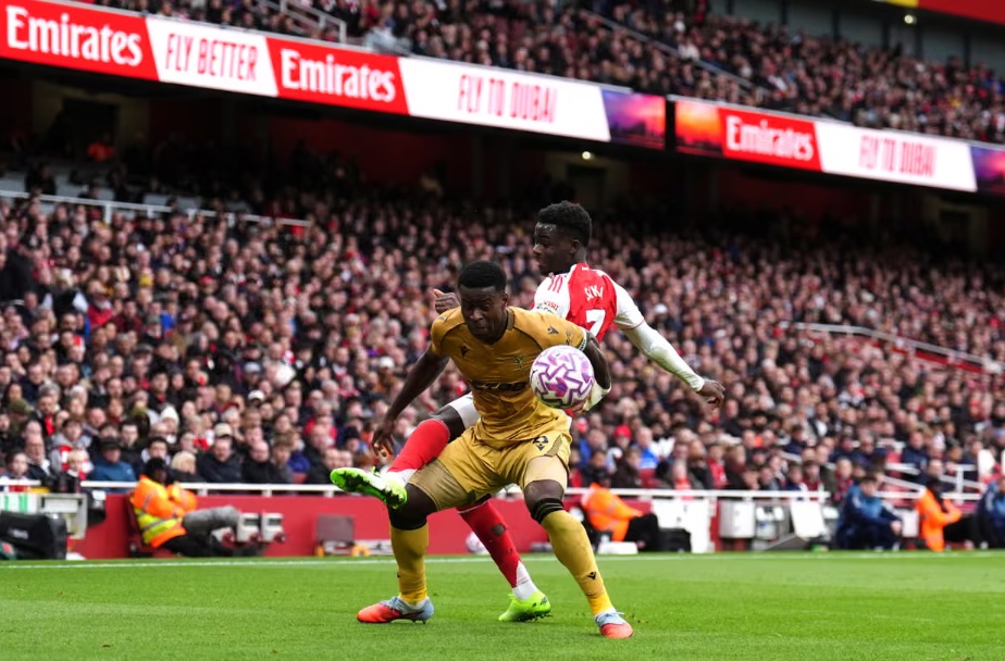 Marc Guehi của Crystal Palace truy cản Bukayo Saka trong pha tranh chấp tại sân Emirates.