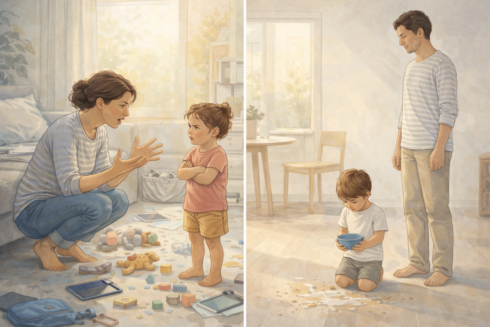 Phong cách giáo dục con trẻ theo gentle parenting (trái), can thiệp và giải thích nhiều. Bên phải minh họa cho cách dạy con theo trường phái Fafo: cha mẹ đứng quan sát, không can thiệp, để trẻ tự trải nghiệm hậu quả nhỏ trong môi trường an toàn - Ảnh: Kitty Nguyễn