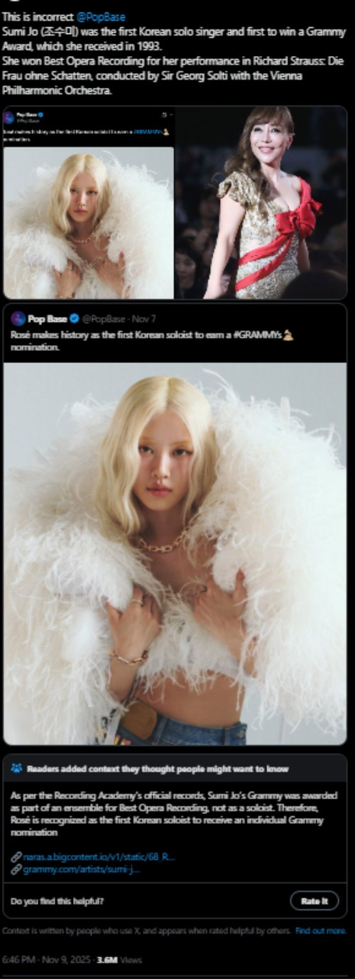 Tuy nhiên, một tài khoản trên X cho rằng điều này không đúng, retweet và tag tên một trang tin lớn. Chủ bài viết chỉ ra Sumi Jo mới là ca sĩ solo đầu tiên được đề cử và chiến thắng Grammys (vào năm 1993). Cô chiến thắng hạng mục Best Opera Recording (Bản thu opera xuất sắc nhất) với vở diễn Richard Strauss: Die Frau ohne Schatten.