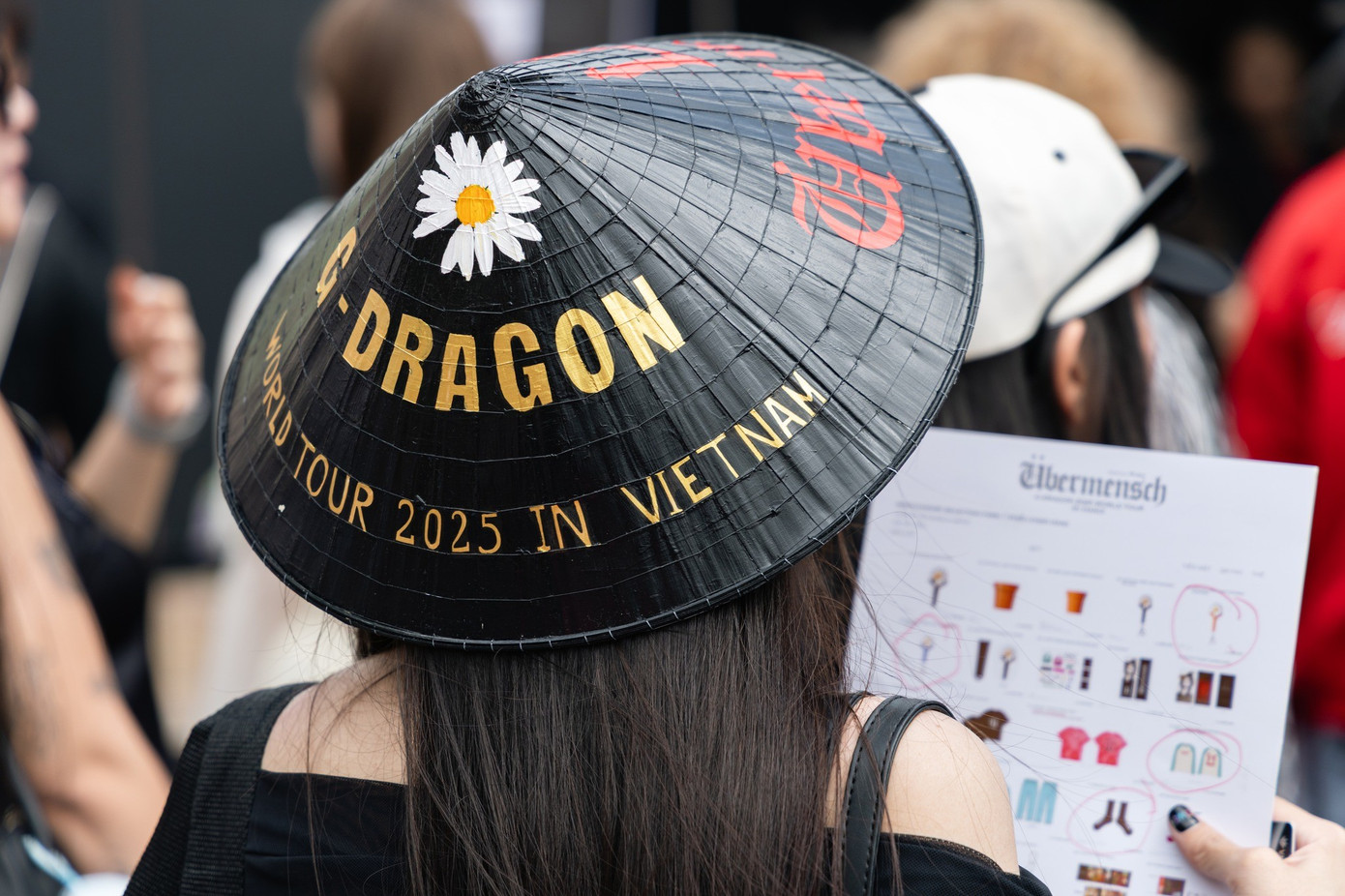 Fan Việt còn cho thấy sự tinh tế khi lồng ghép các yếu tố văn hóa vào trang phục. Điển hình là sự xuất hiện của chiếc nón lá hoa cúc cùng dòng chữ "G-Dragon 2025 World Tour Übermensch in VIETNAM" độc bản, một sự kết hợp độc đáo và đầy ý nghĩa.