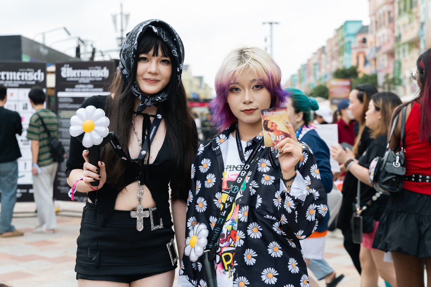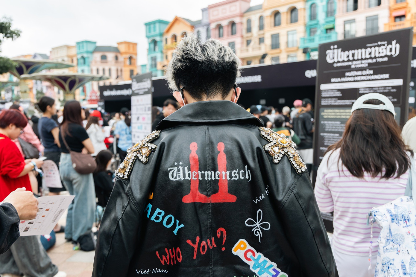 Các fan ưa chuộng các thiết kế mang đậm chất đường phố như layer và các loại áo khoác ngoài cá tính. Blazer dáng rộng hoặc áo khoác da hầm hố là những item được lựa chọn hàng đầu. Trong đó, một fan nam đã gây ấn tượng với chiếc áo khoác da được thêu đính cầu kỳ logo tour "ÜBERMENSCH" cùng các khẩu hiệu như "Who you?".