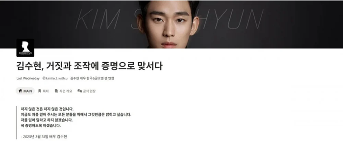 Cộng đồng người hâm mộ Kim Soo Hyun trên toàn cầu đang có những động thái tổ chức ở quy mô hiếm thấy nhằm bảo vệ nam diễn viên trước ồn ào đời tư kéo dài suốt 9 tháng qua. Thay vì chỉ lên tiếng bằng hashtag hay tuyên bố trên mạng xã hội như thường thấy, fandom của Kim Soo Hyun đã lựa chọn cách làm bài bản hơn khi chính thức cho ra mắt một trang web "kiểm chứng sự thật", được cho là xây dựng trên nền tảng Notion.