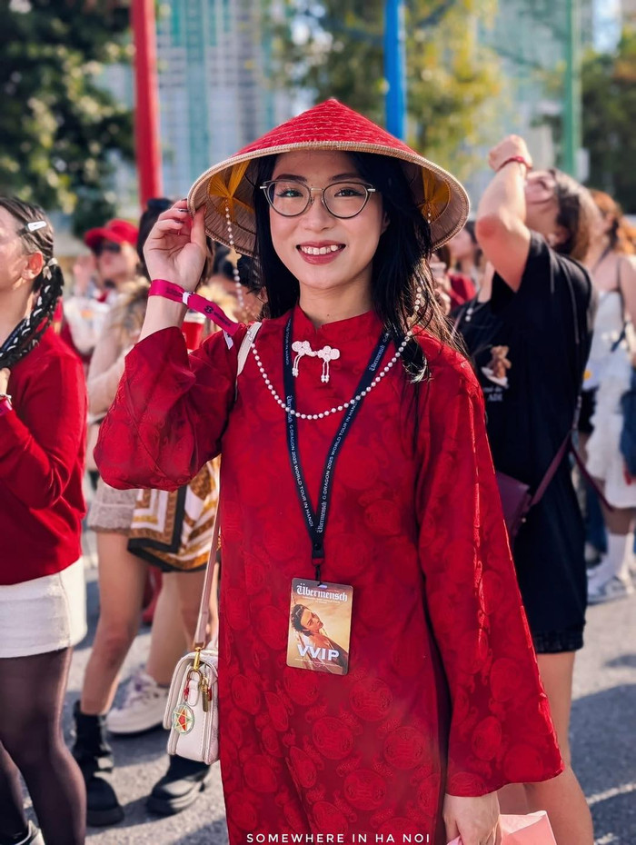 Giữa dòng người rực rỡ sắc màu, nhiều fan gây ấn tượng mạnh với gu thời trang vừa phá cách vừa ý nghĩa. Một khán giả nữ chọn diện áo dài đỏ truyền thống, kết hợp nón lá và vòng ngọc trai, khéo léo hòa trộn nét văn hóa Việt với tinh thần thời trang đương đại. Nụ cười rạng rỡ cùng tấm thẻ VIP trên cổ khiến cô trở thành đại diện visual cho tinh thần tự hào dân tộc tại sự kiện quốc tế.