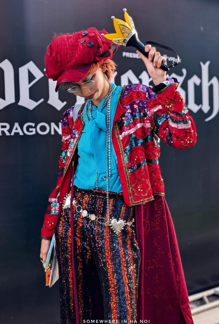 Không kém cạnh, một fan khác lại khiến người xung quanh trầm trồ với outfit mang hơi hướng avant-garde, phối hợp giữa áo sơ mi xanh, áo khoác đính sequin đỏ và quần ánh kim nhiều màu. Chiếc vương miện vàng trên tay trở thành điểm nhấn, như lời tri ân đến biểu tượng "King G-Dragon". Sự táo bạo trong cách phối màu và phụ kiện cho thấy tinh thần dám thể hiện bản thân, điều mà chính G-Dragon luôn truyền cảm hứng cho người hâm mộ suốt nhiều năm qua.