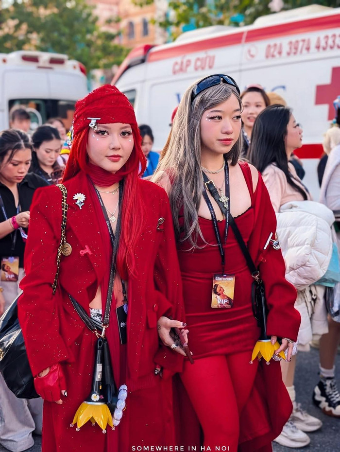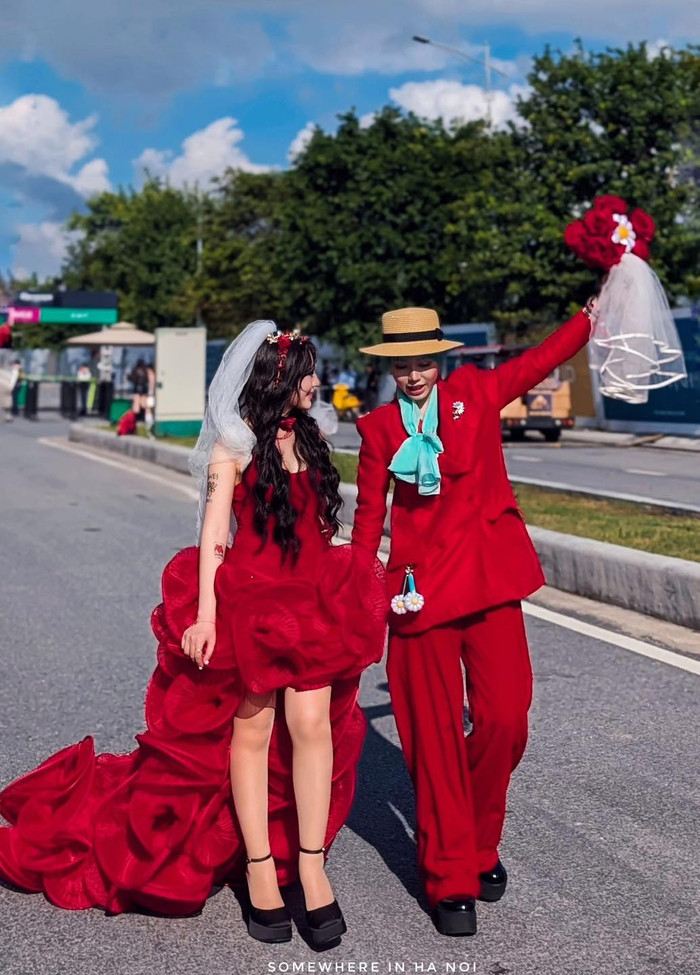 Đặc biệt, cặp đôi xuất hiện trong concept cô dâu - chú rể đỏ rực cũng thu hút mọi ống kính. Người diện váy hoa khổng lồ, phần tà bồng bềnh như cánh hoa nở rộ, người kia lại chọn vest đỏ tươi cùng mũ rộng vành và nơ xanh ngọc. Cả hai vừa nắm tay vừa cười nói vui vẻ, thể hiện tinh thần yêu đời và năng lượng tích cực, đúng như không khí bùng nổ của buổi concert.