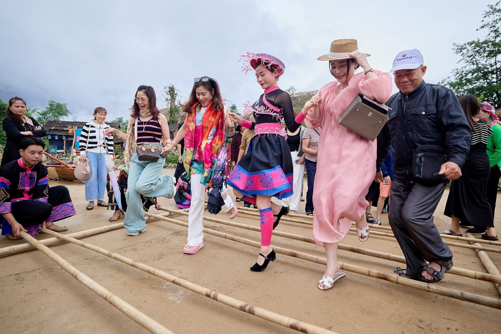 Du khách hào hứng tham gia trò chơi dân gian tại Bản Mây