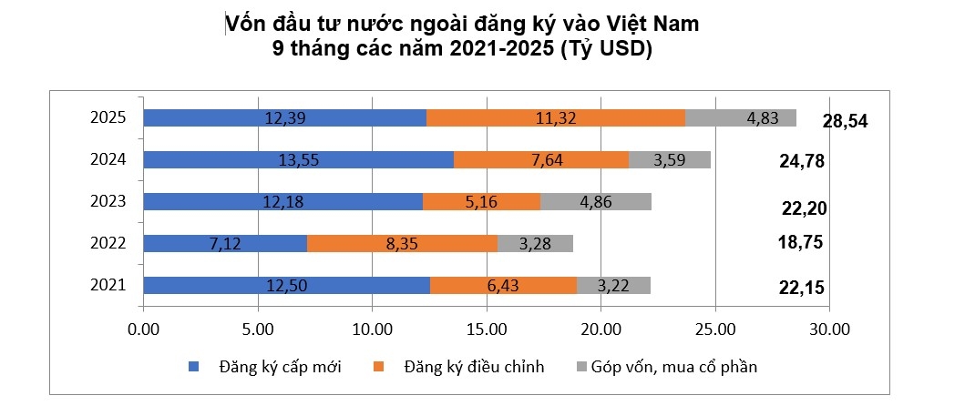 9 tháng qua, vốn đăng ký cấp mới có 2.926 dự án được cấp phép với số vốn đăng ký đạt 12,39 tỷ USD, tăng 17,4% so với cùng kỳ năm trước về số dự án và giảm 8,6% về số vốn đăng ký. Ngành công nghiệp chế biến, chế tạo được cấp phép mới đầu tư trực tiếp nước ngoài lớn nhất với số vốn đăng ký đạt 7,27 tỷ USD, chiếm 58,7% tổng vốn đăng ký cấp mới. Hoạt động kinh doanh bất động sản đạt 2,57 tỷ USD, chiếm 20,7%; các ngành còn lại đạt 2,55 tỷ USD, chiếm 20,6%.