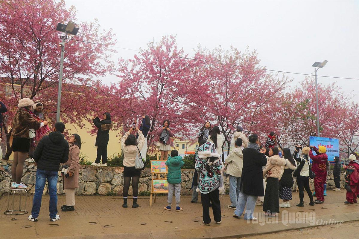 Đông đảo du khách chụp ảnh với hoa mai anh đào nở rộ.