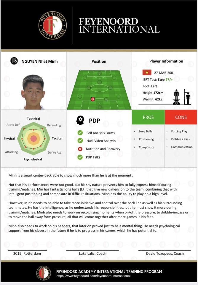 Bản đánh giá của CLB Feyenoord về Nhật Minh. (Ảnh: HAGL)