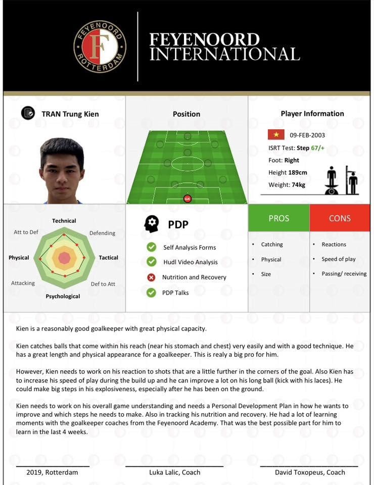 Bản đánh giá của CLB Feyenoord về Trung Kiên. (Ảnh: HAGL)