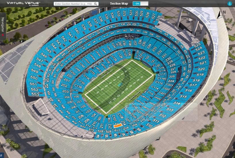 Sơ đồ phân loại hạng ghế tại sân SoFi ở Los Angeles (Mỹ), trong đó các hàng ghế 100 và 200 tương ứng với hạng vé loại 1 và 2. Ảnh chụp màn hình
