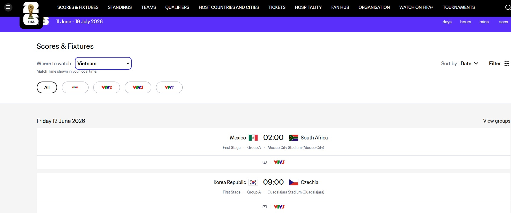 Trang chủ của Liên đoàn Bóng đá thế giới (FIFA) đăng tải lịch phát sóng các trận đấu ở World Cup 2026 trên kênh VTV3. Ảnh chụp màn hình trang fifa.com