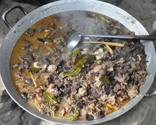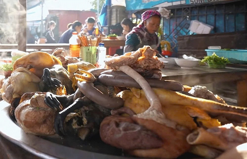 Không xa, những nồi thắng cố ngựa nghi ngút khói thu hút mọi ánh nhìn. Món ăn truyền thống của người Mông này được ninh từ thịt, xương và nội tạng ngựa cùng thảo quả, quế, hồi, lá đắng. Mùi hương thảo mộc đặc trưng, kết hợp với chén rượu ngô cay nồng, đủ làm ấm lòng du khách giữa tiết trời giá lạnh. Ảnh dacsanViet