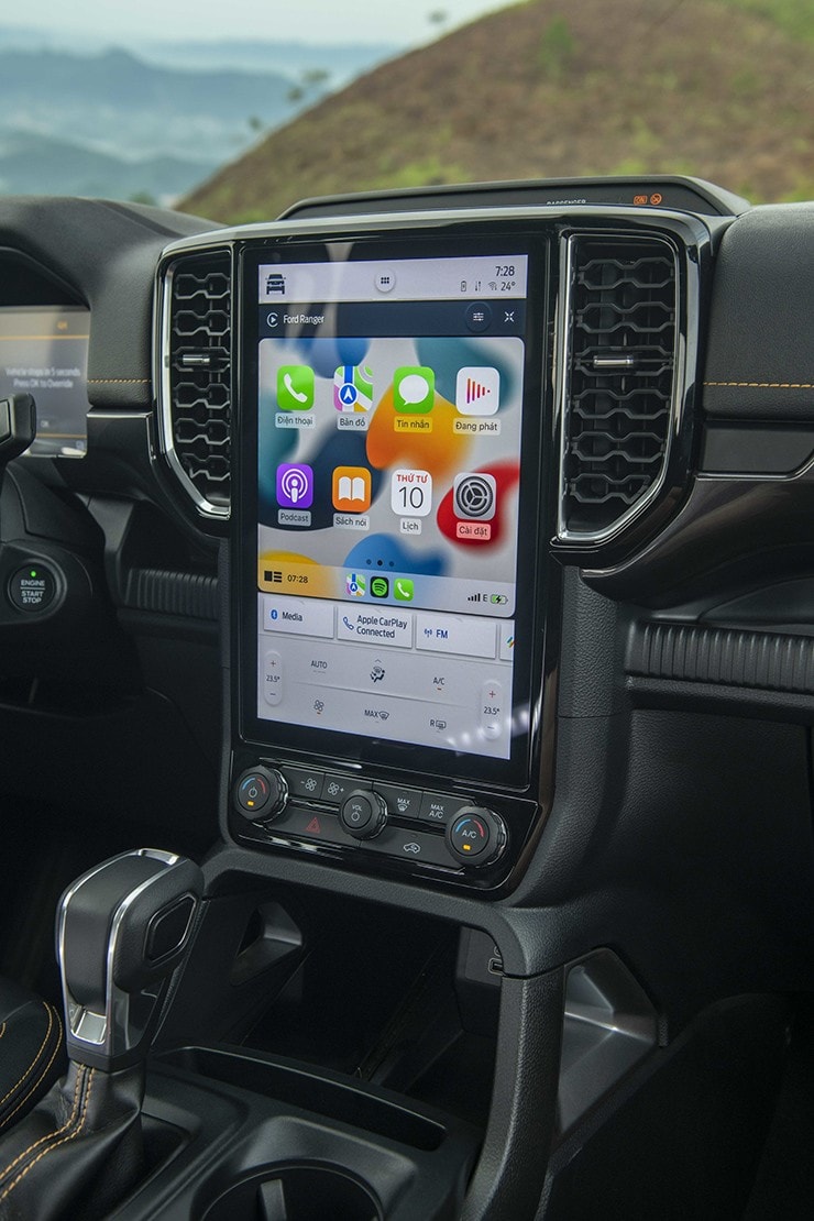 Khoang cabin của Ranger thế hệ mới được đánh giá là hiện đại nhất phân khúc với các vật liệu cao cấp. Trung tâm táp-lô là màn hình giải trí 12 inch đặt dọc, hỗ trợ SYNC 4 và kết nối Apple CarPlay/Android Auto không dây. Phía sau vô-lăng 3 chấu là màn hình kỹ thuật số 8 inch hiển thị sắc nét.