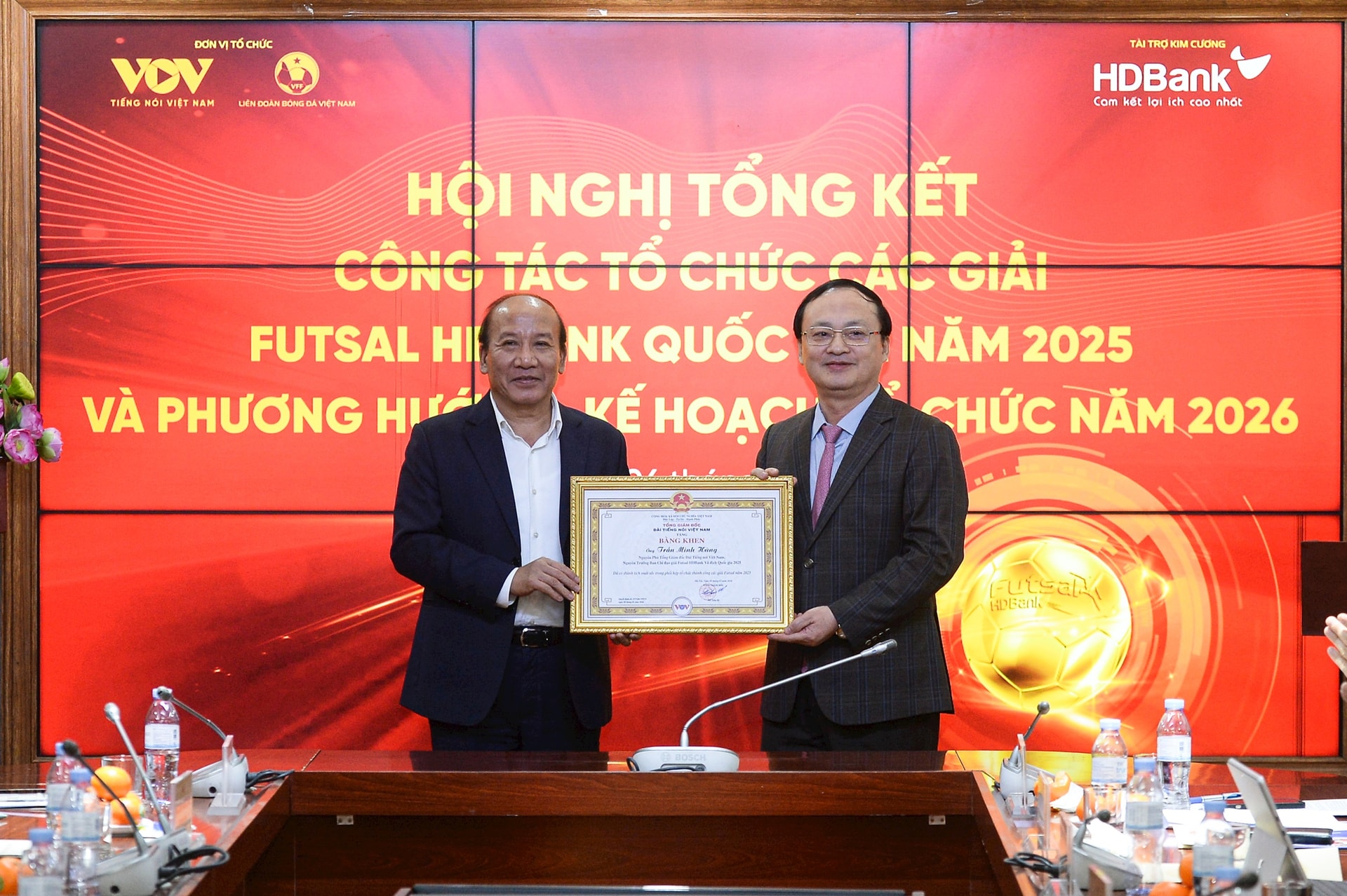 Tại hội nghị, ông Đỗ Tiến Sỹ đã trao Bằng khen của Tổng Giám đốc Đài Tiếng nói Việt Nam tặng ông Trần Minh Hùng, nguyên Phó Tổng Giám đốc VOV, nguyên Trưởng Ban Chỉ đạo Giải Futsal HDBank Vô địch Quốc gia năm 2025, nhằm ghi nhận những đóng góp quan trọng trong công tác chỉ đạo và tổ chức giải đấu.