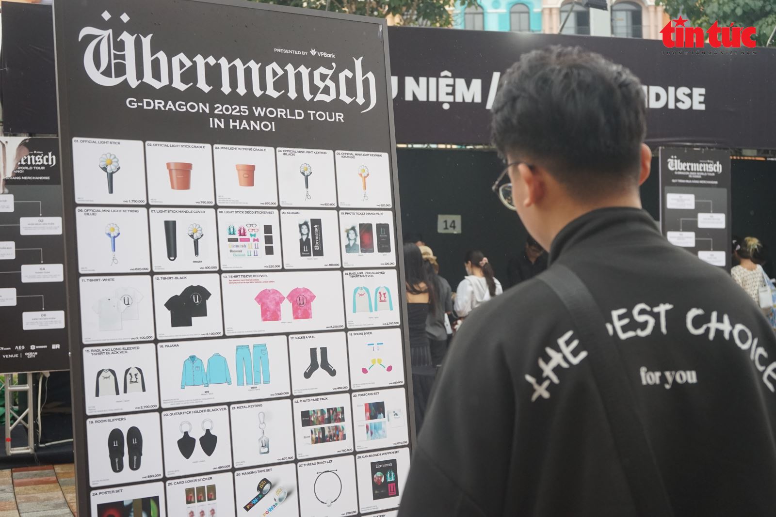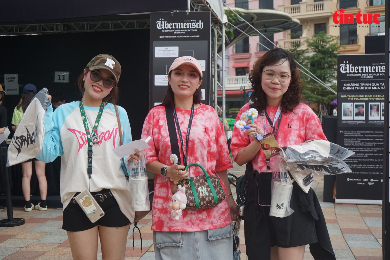 Tại khu vực mua sắm, hàng dài người hâm mộ kiên nhẫn xếp hàng chọn những món đồ lưu niệm của nam ca sĩ. Một số fan diện chiếc áo hoa hồng ấn tượng kết hợp cùng nhiều phụ kiện mang dấu ấn cá nhân của G-Dragon, khiến không gian check-in rực rỡ và giàu năng lượng.