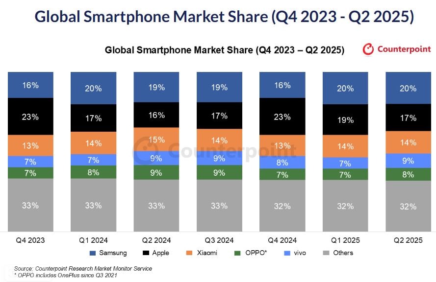 Theo Counterpoint Research, trong quý 2/2025, Apple chiếm khoảng 17% thị phần smartphone toàn cầu, chỉ đứng sau hãng dẫn đầu là Samsung, và bỏ xa hầu hết đối thủ Trung Quốc khác.