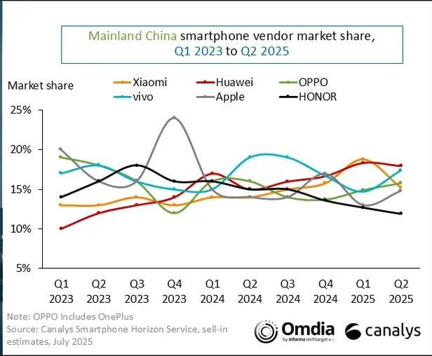 Tại Trung Quốc, theo Omdia, thị trường smartphone trong quý 2/2025 giảm 4% so với cùng kỳ năm 2024. Apple chỉ đứng thứ 5, với 10,1 triệu thiết bị xuất xưởng, trong khi Huawei dẫn đầu với 12,2 triệu máy, tương đương 18% thị phần, và vivo theo sát với 11,8 triệu (17%).