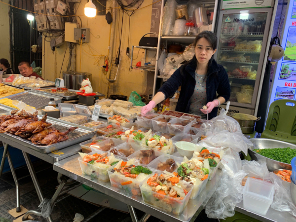 Tại chợ Hàng Bè (phường Hoàn Kiếm), nơi nổi tiếng là "chợ nhà giàu" với những thực phẩm nấu chín sẵn, những con gà trống được buộc cánh, tạo dáng luộc sẵn liên tục được vớt ra khỏi nồi. Mặc dù theo người bán, ngày mai (29 Tết) mới là cao điểm khách lấy gà lễ cho đêm giao thừa, nhưng hôm nay đã có rất nhiều khách mua gà lễ sớm. "Khách đặt, chuyển tiền trước để mai lấy gà nhiều lắm, nhà tôi đêm nay phải huy động thêm người mới đủ phục vụ", chị Dung quầy bán xôi, gà chia sẻ.