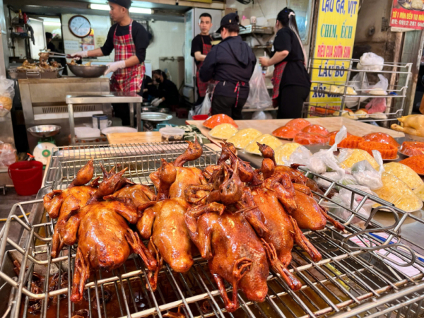 Năm nay, theo các tiểu thương chợ Hàng Bè, nhiều gia đình cũng lựa chọn thêm chim bồ câu quay cho ngày Tết. Chim bồ câu được tẩm gia vị riêng biệt theo từng nhà bán, quay vàng óng màu mật ong. Giá chim quay 160.000 đồng -180.000 đồng/con, đắt hơn ngày thường 10.000 - 20.000 đồng/con.