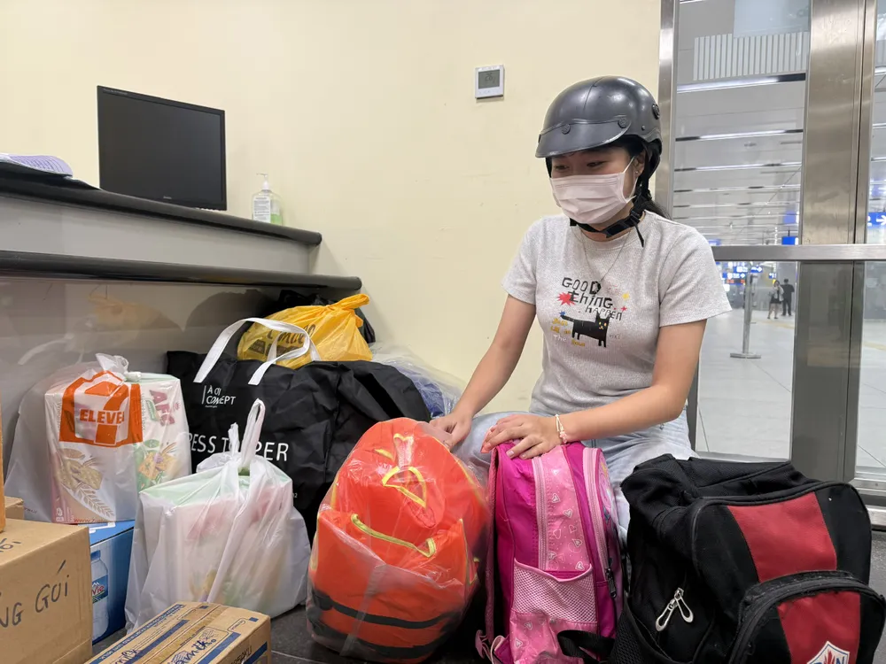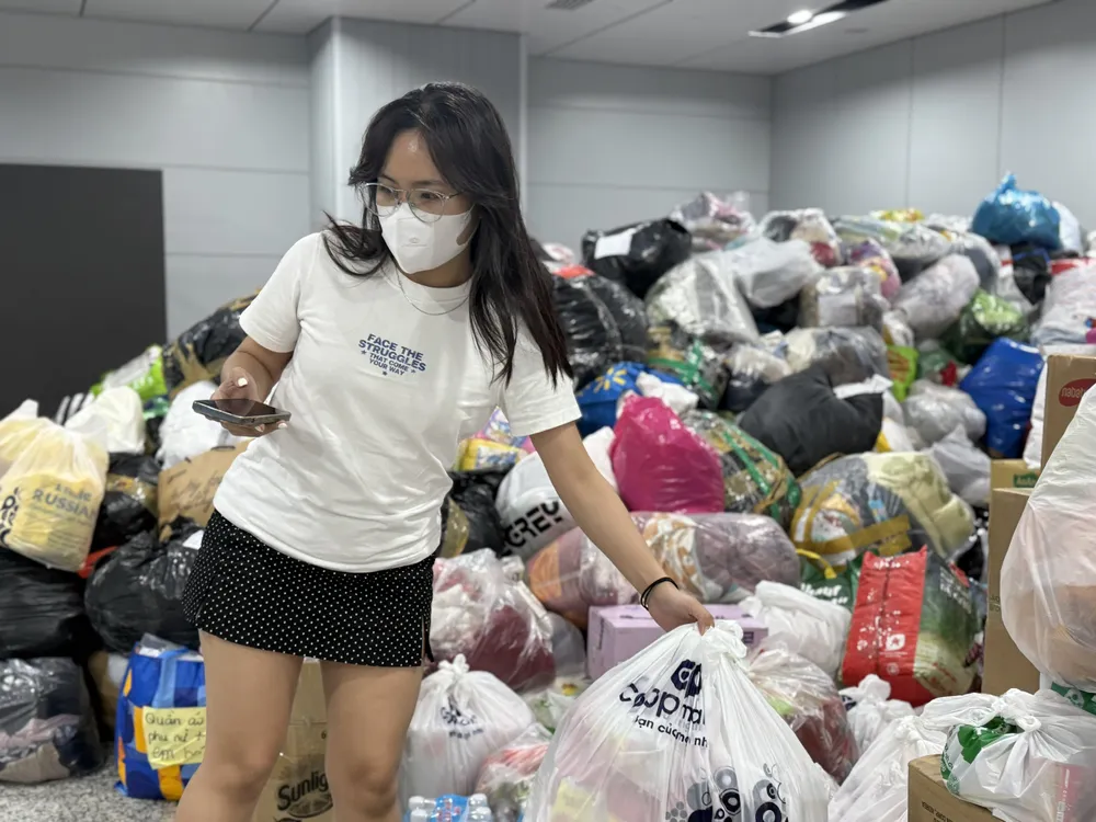 Tại ga Metro Bason, Trần Nhu Mì (sinh viên năm 3, Trường Đại học Sài Gòn) đứng ôm túi đồ cứu trợ. Biết điểm tập kết qua TikTok, thấy cảnh nhà cửa chìm trong nước, người dân chạy lũ, Mì tranh thủ sau giờ học đến gửi quần áo, cặp và áo phao.