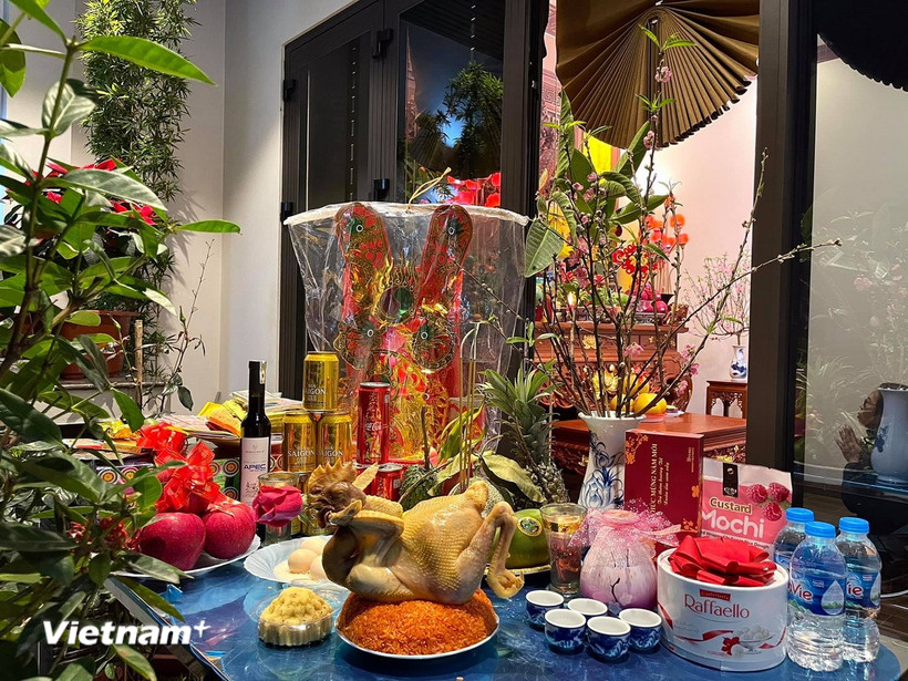 Lễ vật gà ngậm hoa hồng đỏ trong mâm cỗ cúng đêm Giao thừa. (Ảnh: Vietnam+)