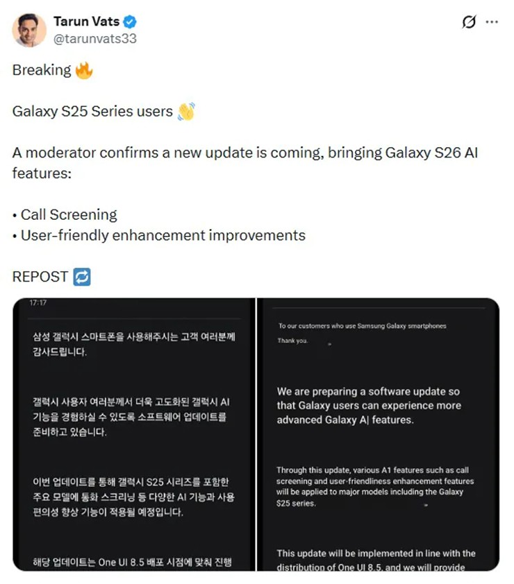 Báo cáo từ người dùng Tarun Vats trên mạng xã hội X, các tính năng AI tiên tiến của Galaxy, bao gồm sàng lọc cuộc gọi bằng AI, sẽ được đưa vào dòng Galaxy S25 thông qua bản cập nhật One UI 8.5.