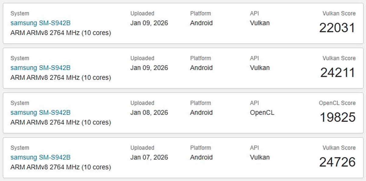 Điểm nhấn đáng chú ý nhất nằm ở hiệu suất đồ họa (GPU). Exynos 2600 ghi nhận mức điểm Vulkan dao động từ 19.825 đến 24.726 điểm. Kết quả này cho thấy Samsung đang tiến rất gần đến hiệu năng của Snapdragon 8 Elite Gen 5, vốn thường đạt khoảng 25.083 điểm.