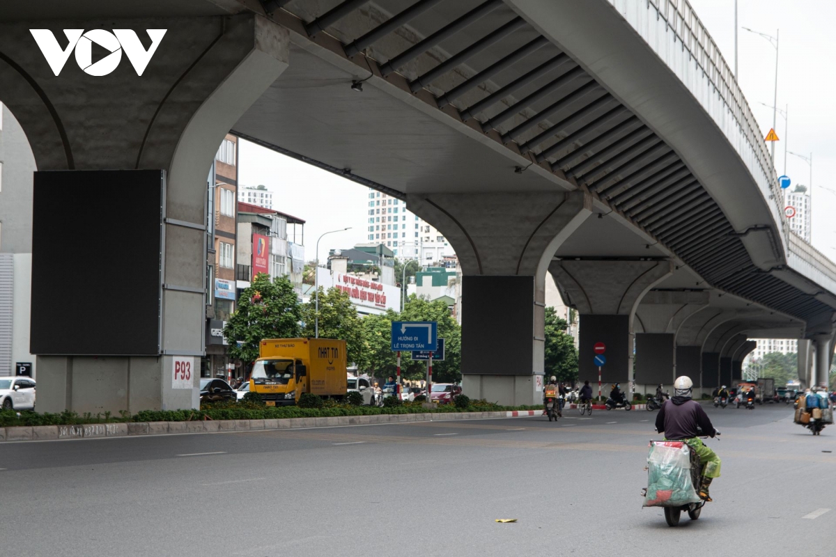 Sáng 5/11, theo ghi nhận của phóng viên, đoạn từ cầu Vĩnh Tuy đến Ngã Tư Sở đã được dựng khung thép; riêng khu vực từ ngã tư Tôn Thất Tùng – Trường Chinh đến Ngã Tư Sở, nhiều trụ cầu đã lắp hoàn thiện các màn hình LED cỡ lớn.