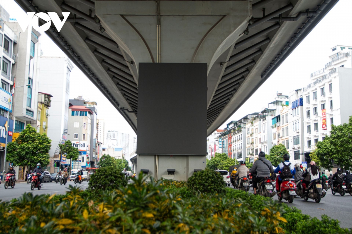 Hầu hết các trụ dưới gầm cầu cạn thuộc tuyến Vành đai 2 (đoạn qua Ngã Tư Sở, Hà Nội) đã được lắp hàng loạt màn hình LED cỡ lớn.
