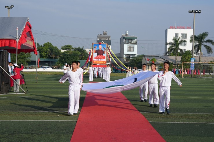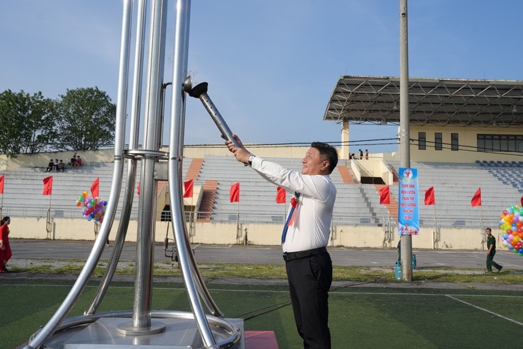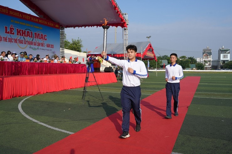Tiếp đó, vận động viên Lê Đặng Đức Việt, Huy chương vàng SEA Games 31, vinh dự cầm đuốc tiến lên lễ đài, trao ngọn lửa thiêng cho Bí thư Đảng ủy, Chủ tịch HĐND xã Bùi Hoàng Phan để thắp sáng đài lửa Đại hội.