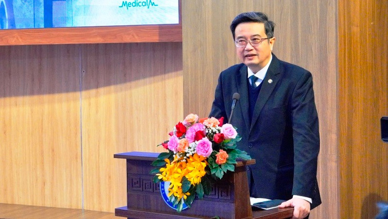 Giáo sư, Tiến sĩ Nguyễn Vũ Quốc Huy, Hiệu trưởng Trường Đại học Y - Dược Huế phát biểu tại hội thảo.