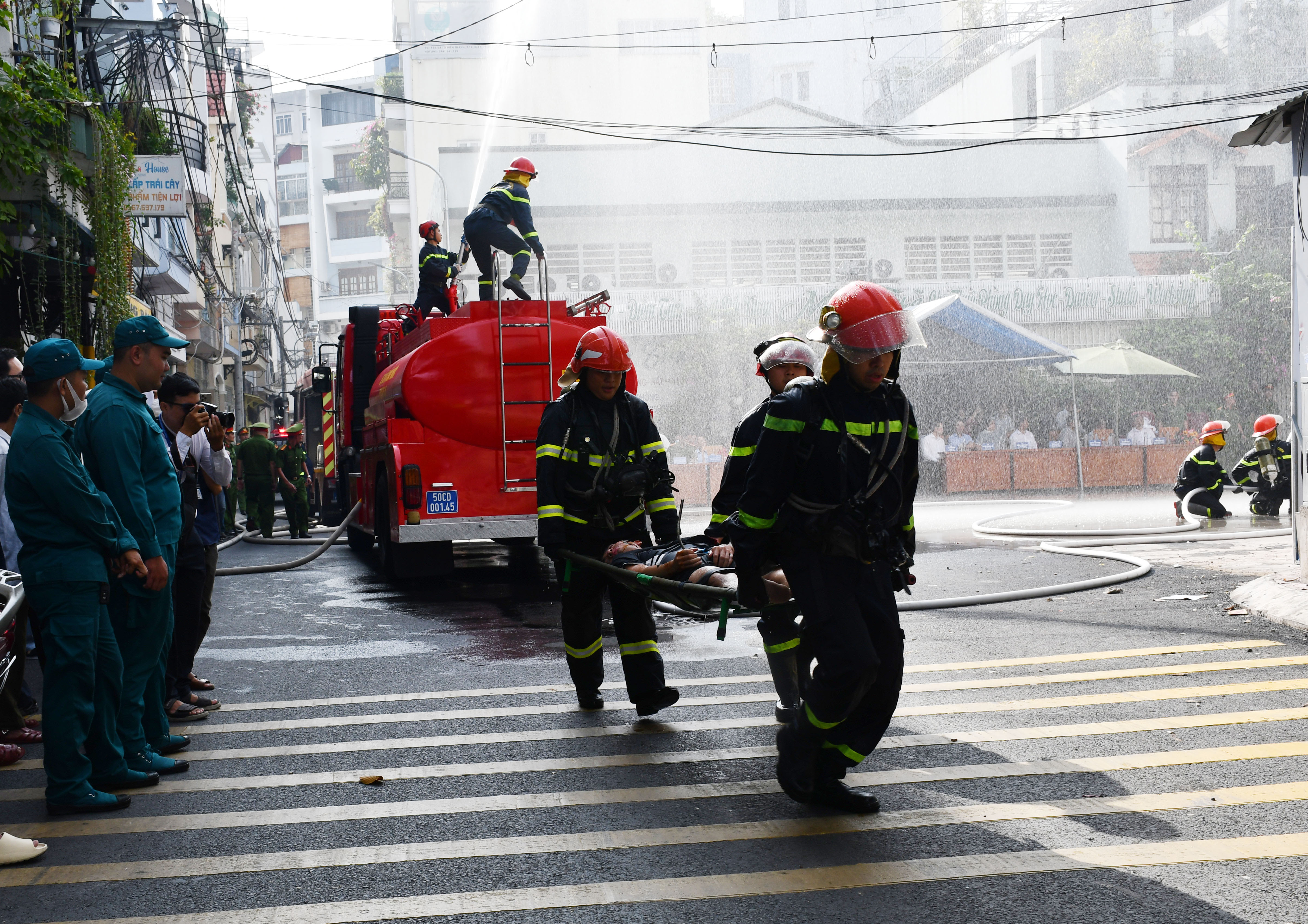 Sau khi nhận được tin báo, lực lượng Cảnh sát PCCC và CNCH khẩn trương điều động phương tiện cùng cán bộ chiến sĩ đến hiện trường phối hợp với lực lượng tại chỗ dập lửa và cứu người bị nạn.