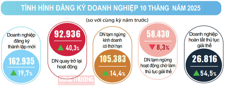 Tính chung 10 tháng năm 2025, số doanh nghiệp tạm ngừng kinh doanh có thời hạn là 105,4 nghìn doanh nghiệp, tăng 14,4% so với cùng kỳ năm trước; 58,4 nghìn doanh nghiệp ngừng hoạt động chờ làm thủ tục giải thể, giảm 8,3%; 26,8 nghìn doanh nghiệp hoàn tất thủ tục giải thể, tăng 54,5%. Bình quân một tháng có 19,1 nghìn doanh nghiệp rút lui khỏi thị trường.