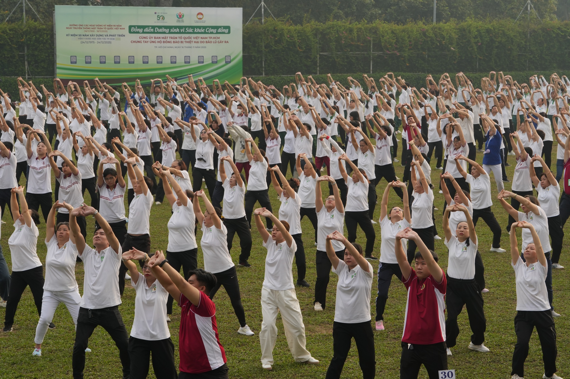Trong buổi đồng diễn, Ủy ban MTTQ Việt Nam TP.HCM đã kêu gọi người dân thành phố tiếp tục ủng hộ, hướng về đồng bào miền Trung và miền Bắc đang chịu ảnh hưởng bão lũ.