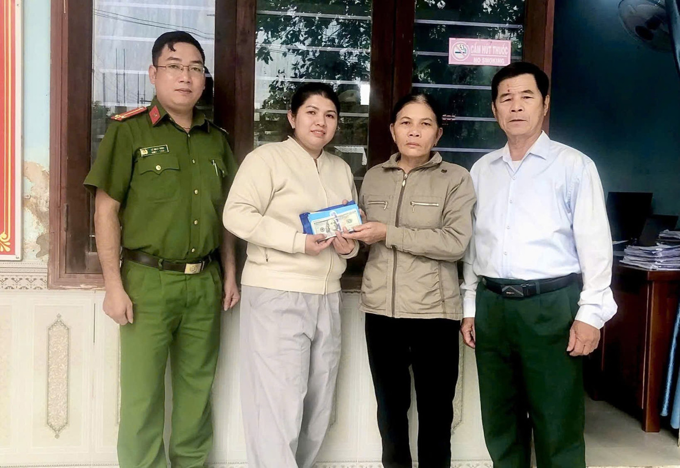 Trao trả số tiền cho chủ nhân bỏ quên trong túi đồ cứu trợ. Ảnh CA