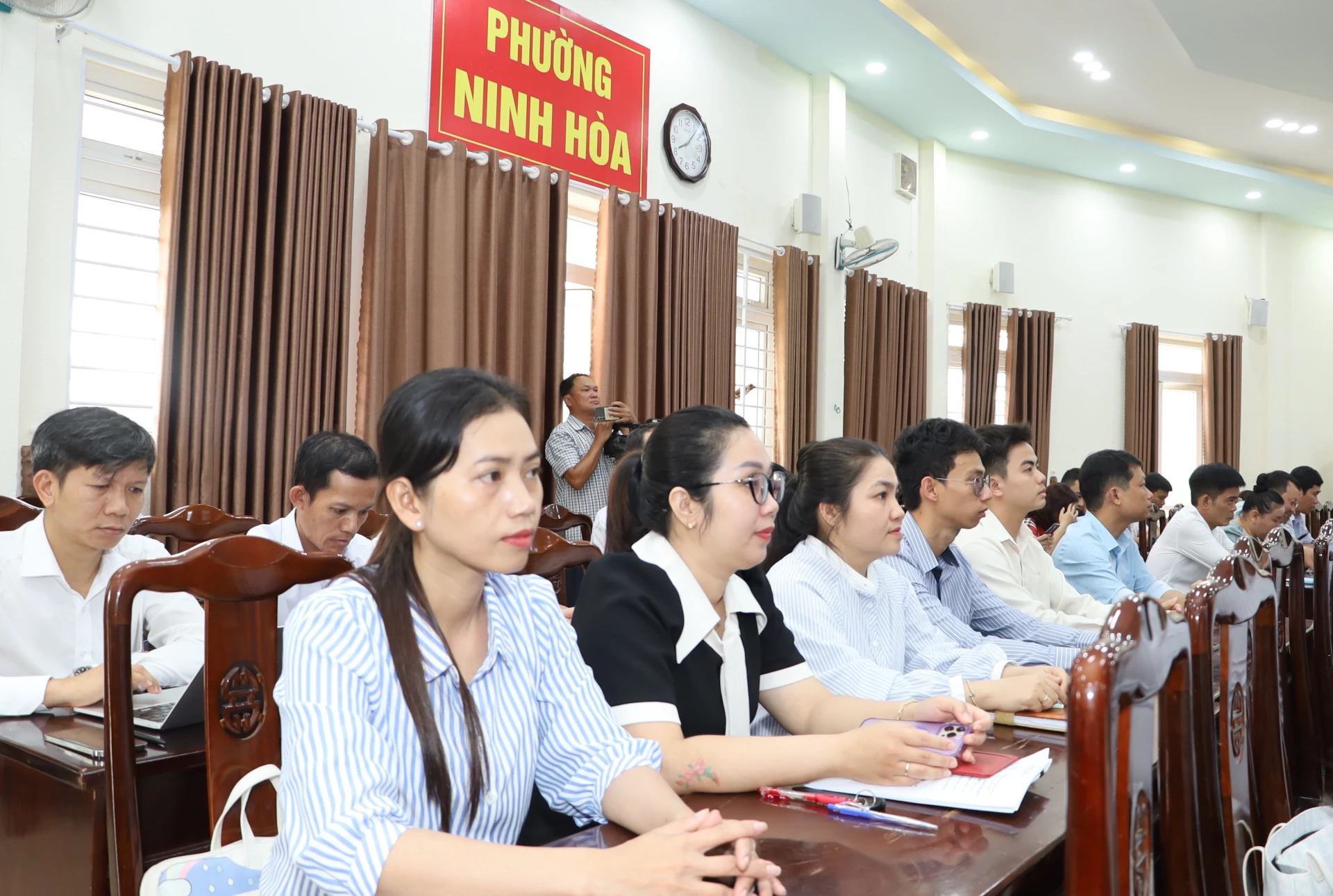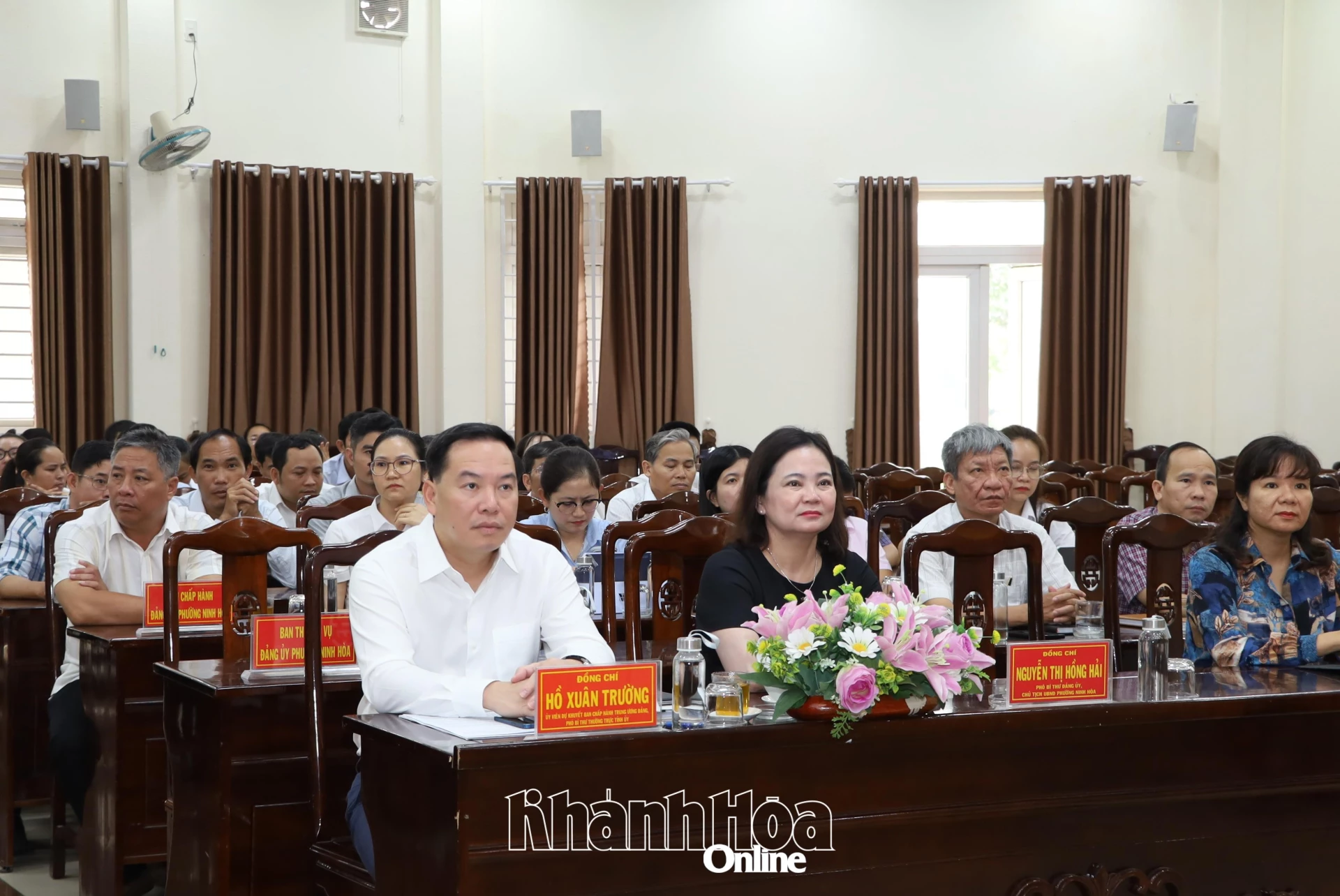 Đồng chí Hồ Xuân Trường dự hội nghị tại điểm cầu Đảng ủy phường Ninh Hòa. Ảnh: VĂN GIANG