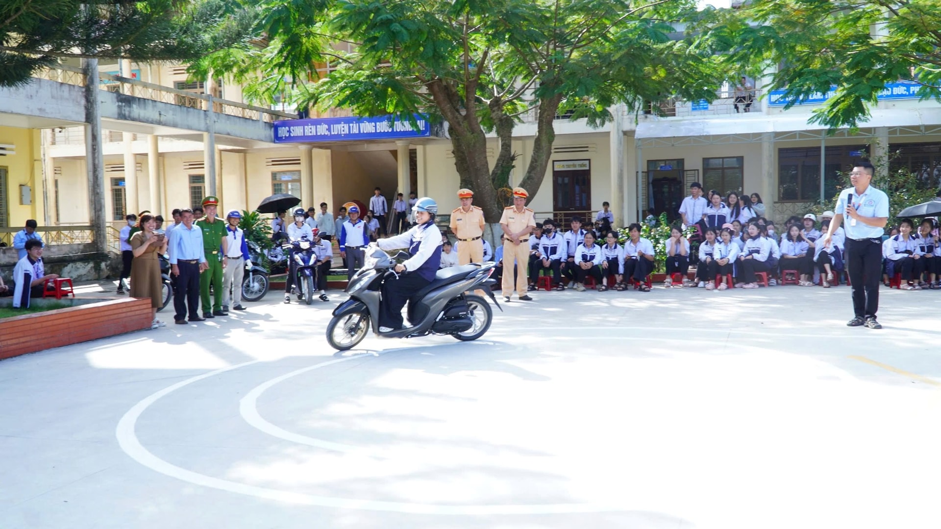Đặc biệt, các em học sinh được phổ biến kiến thức Luật Giao thông đường bộ, tham gia thực hành lái xe, chạy thử vòng số 8 và vượt chướng ngại vật tại sân trường như một buổi thi thực hành cấp giấy phép lái xe máy thực tế.