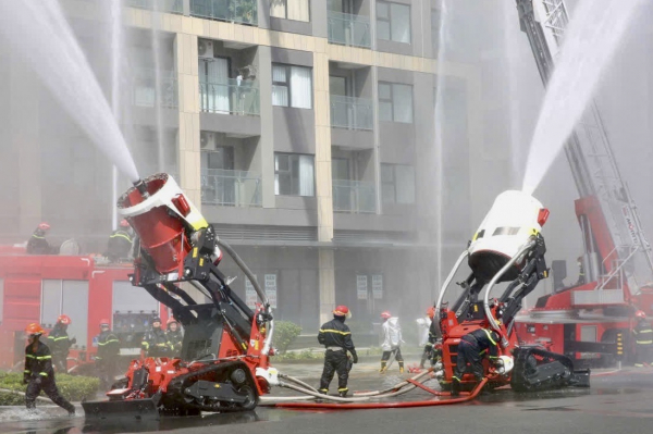 Rô bốt chữa cháy được vận hành dập tắt ngọn lửa.