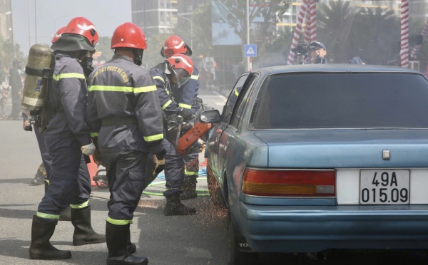 Tổ cứu nạn cứu hộ cưa cắt xe để giải cứu các nạn nhân.