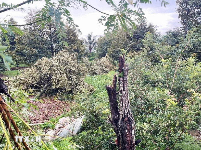 Mưa lớn kèm giông lốc làm gãy đổ nhiều cây trồng của người dân. (Ảnh: TTXVN phát)
