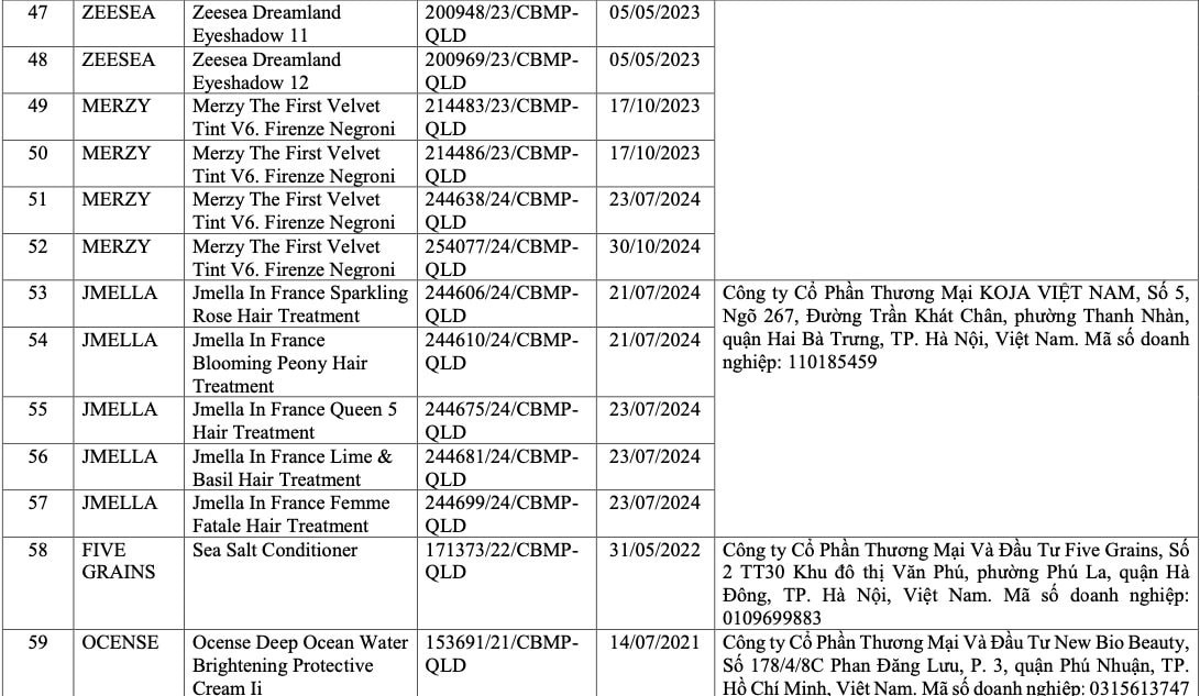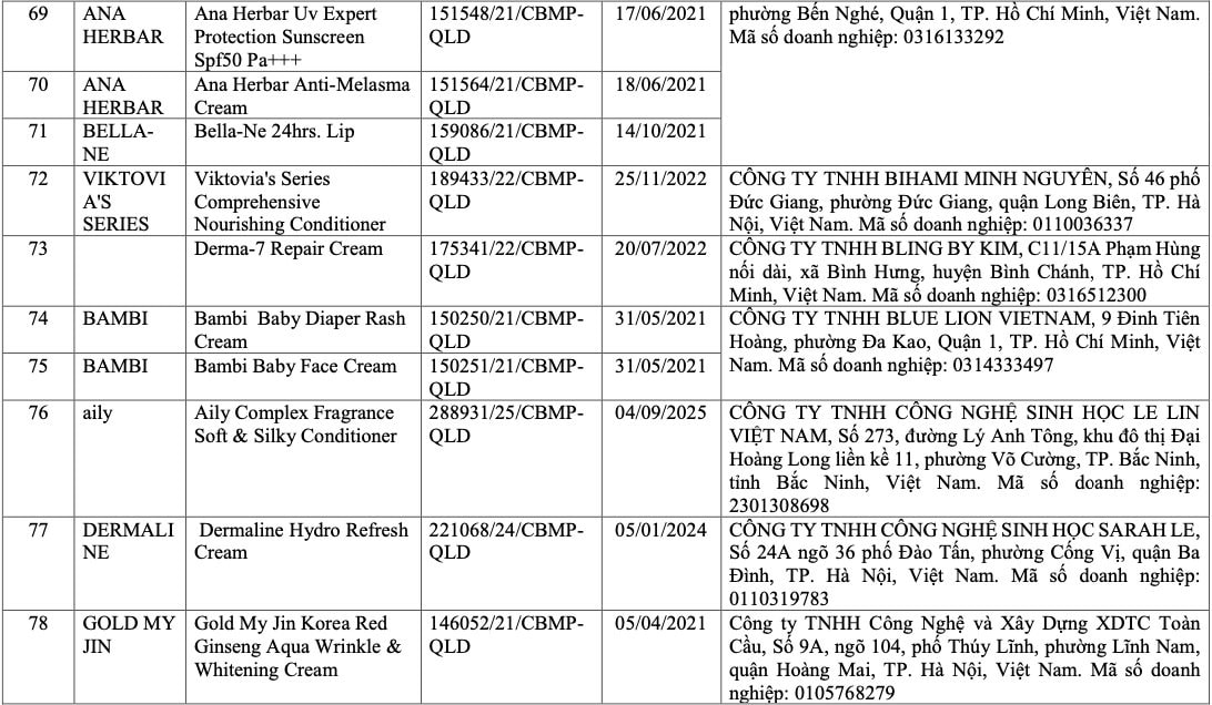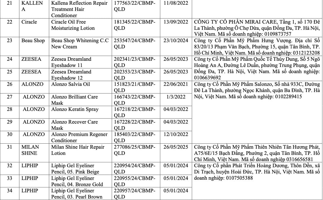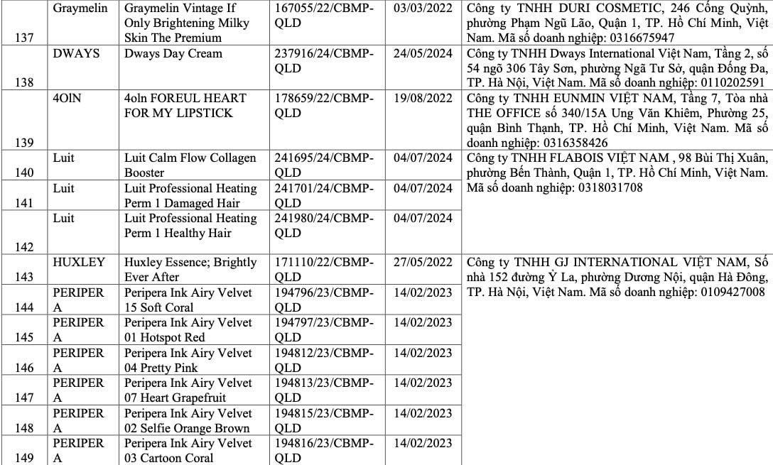 Danh sách do Cục Quản lý Dược công bố bao gồm 291 sản phẩm thuộc nhiều thương hiệu trong và ngoài nước, trải rộng ở các nhóm hàng như chăm sóc da, trang điểm và sản phẩm tóc.