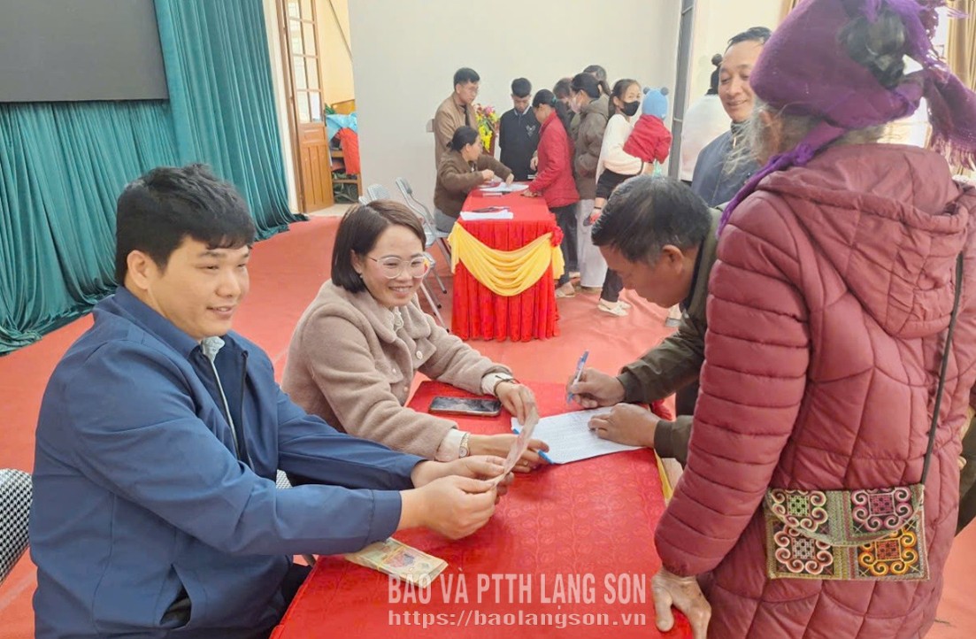Cán bộ xã Bằng Mạc thực hiện thủ tục trao quà cho người dân theo Nghị quyết số 418 của Chính phủ