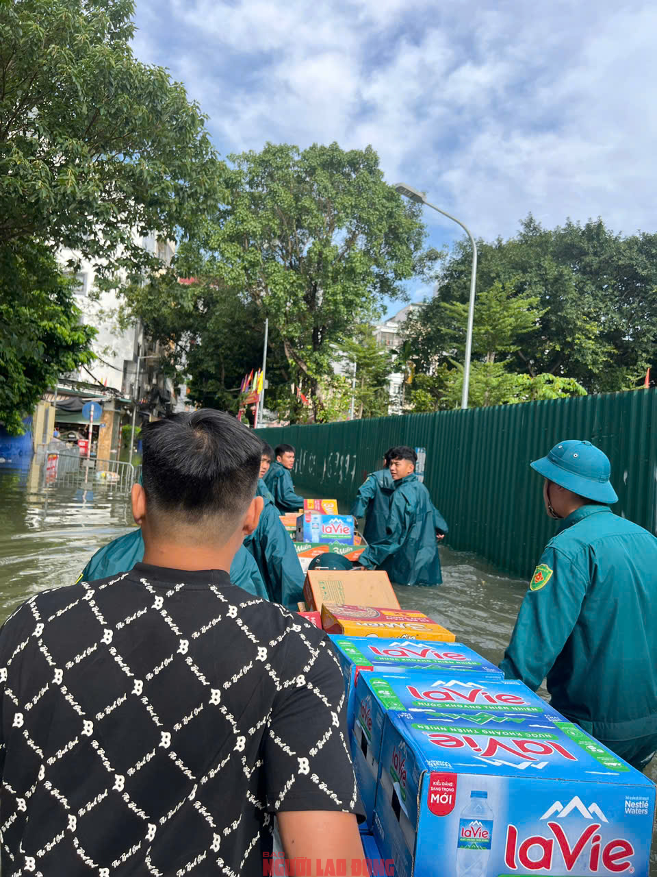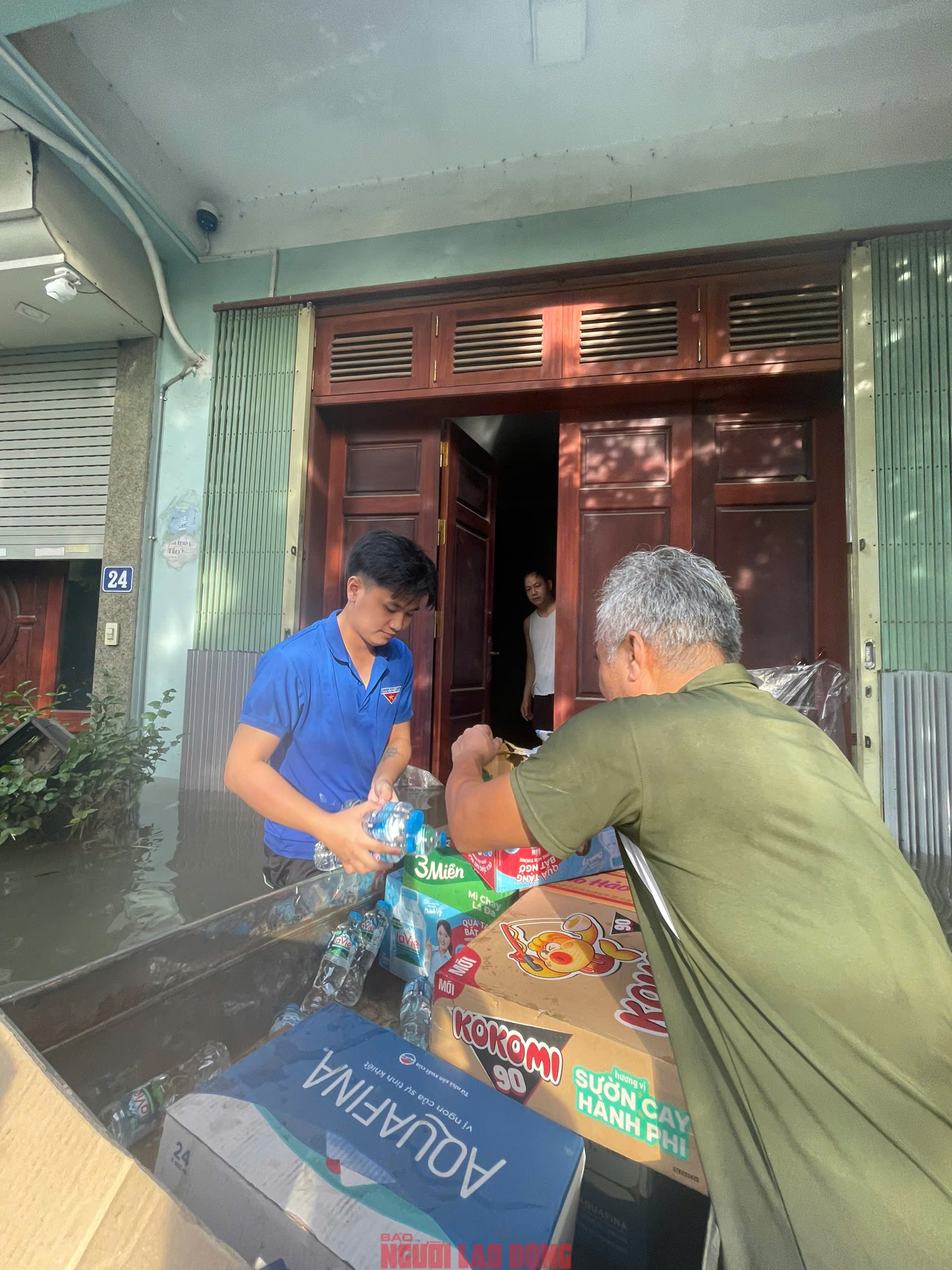 Trước khó khăn của người dân, chiều tối 1-10, UBND - Ủy ban MTTQ - Hội Phụ nữ Phường Từ Liêm đã đi từng ngõ, ngách các hộ gia đình nơi đây để phát những phần hỗ trợ gồm mì gói, lương khô và những chai nước sạch để giúp người dân tạm thời khắc phục. Ảnh: Văn Duẩn