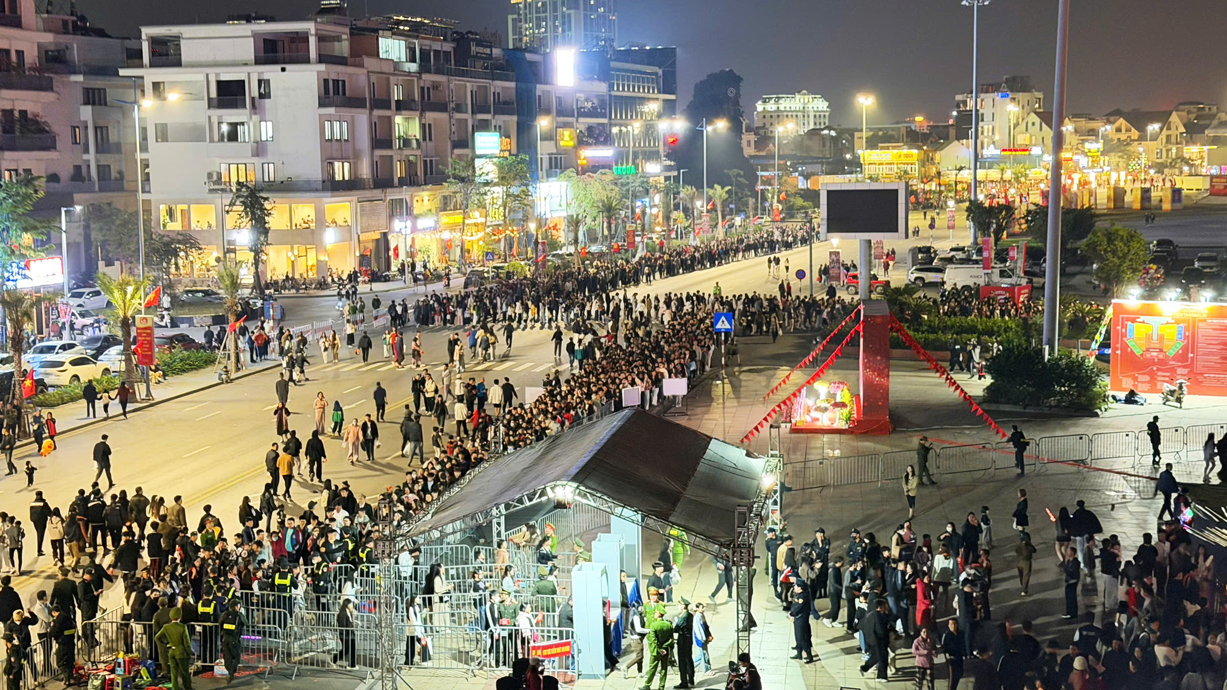 Dòng người xếp hàng trật tự để làm thủ tục check-in vé vào sân khấu chính chương trình Countdown chào năm mới 2026 tại Quảng Ninh.