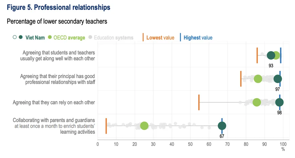 Đặc biệt, 97% giáo viên “đồng ý” hoặc “hoàn toàn đồng ý” rằng hiệu trưởng có mối quan hệ chuyên môn tốt với nhân viên (OECD: 86%).