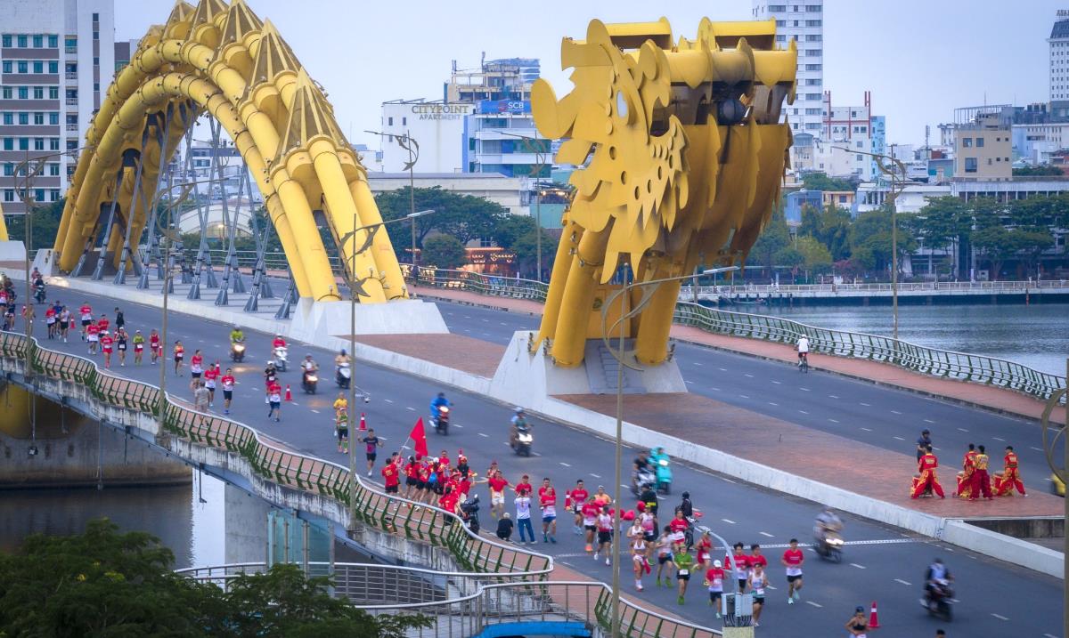 Các vận động viên trên hành trình chạy qua cầu Rồng.