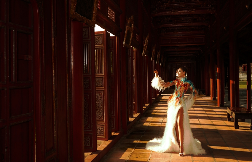 Là những người đẹp đầu tiên khoác lên mình bộ sưu tập, Miss Cosmo 2024 Ketut Permata Juliastrid, Runner-up Miss Cosmo 2024 Mook Karnruethai Tassabut và Đương kim Miss Cosmo Vietnam Nguyễn Hoàng Phương Linh xuất hiện tại không gian Đại Nội Huế trong phong thái cuốn hút. Cả 3 thể hiện vẻ đẹp hài hòa giữa truyền thống và hiện đại, nổi bật qua bảng màu đặc trưng và họa tiết mang dấu ấn Huế.